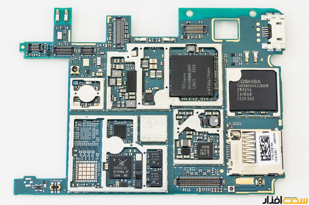 نمایی از بورد اصلی. تمام اجزای اصلی روی این سمت از بورد قرار گرفته است. حافظه ذخیره سازی هشت گیگابایتی محصول توشیبا بوده و حافظه RAM محصول SKhynix است.