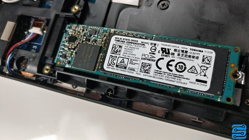 در بخش ذخیره سازی، مادربرد و کابینت دو جایگاه را در اختیار کاربر و شرکت قرار داده اند؛ یک جایگاه 2.5 اینچی به همراه ساتا نسل سوم وجود دارد که می تواند در آن یک SSD یا HDD نصب نمود؛ جایگاه دوم متعلق به یک SSD M.2 است که به اینترفیس NVME متصل است. در این مدل یک SSD M.2 256GB از برند توشیبا نصب شده است. اما یک مشکل در این میان وجود دارد؛ در صورتی که بخواهید از درایو 2.5 اینچی استفاده نمائید، مجبور هستید تا از نصب ماژول M.2 صرف نطر کنید. اما در تمامی کانفیگ های این لپ تاپ ایستگاه کاری، از حافظه های SSD M.2 NVME استفاده شده است.