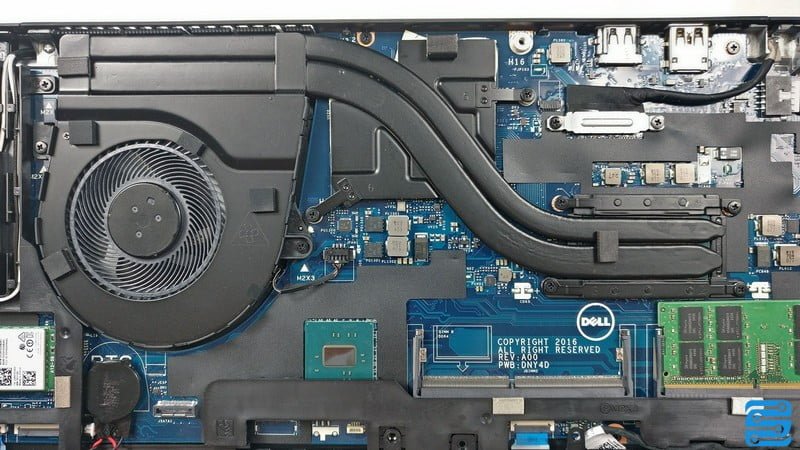 در نهایت به سیستم خنک کننده می رسیم؛ سامانه تهویه دارای دو هیت پایپ است که از روی CPU و GPU عبور کرده و به یک هیت سینک با فن بر می خورد. این خنک کننده دارای یک فن است که تراکم پره های آن بسیار زیاد است. تست های موجود حاکی از آن است که این کولر از پس حرارت به وجود آمده بر می آید. از آنجایی که با یک لپ تاپ ایستگاه کاری مواجه هستیم، نیازمند تهویه برای استفاده های طولانی مدت و سنگین خواهیم بود.