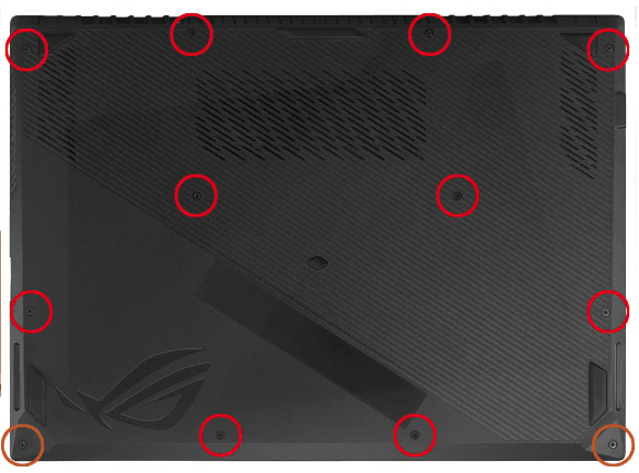 در ابتدا شاهد پیچ های متعدد کابینت زیرین هستیم. نشان ROG حس در اختیار گرفتن محصولی توانمند را حتی در هنگام دید از زیر، به کاربر منتقل می کند. همچنین ورودی های هوا نیز با مهارت خاصی مخفی شده اند. 12 پیچ در این بخش وجود دارد.