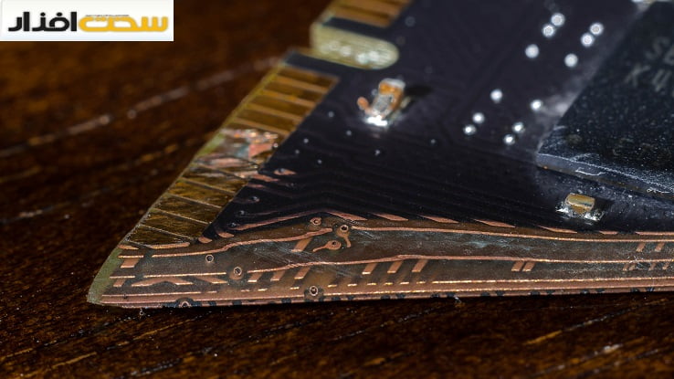 در تصویر زیر می توانید به اعماق لایه های PCB به خوبی اشراف داشته باشید.در اینجا کانال های ارتباطی “مسی” قابل مشاهده است.ارتباط های مسی در لایه های مختلف حرکت کرده و در نقاطی به حالت “نهشته” هستند که توسط یک فرآیند شیمایی پیچیده به لایه های PCB متصل می گردند.این لایه های مسی در بسیاری از قطعات سخت افزاری مانند کارت گرافیک و ماردبرد نیز به همین شیوه موجود هستند.تمامی لایه های PCB دارای خطوط جداگانه مسی هستند.