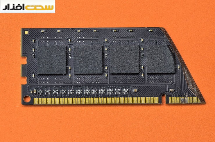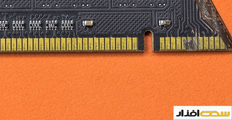در تصویر زیر سمباده شدن پایه های DIMM مشخص است.این پایه ها گاها به وسیله روکش طلا اندود می شوند.طلا بهترین رسانا برای الکترونیک است و این ماده در CPU و قطعات دیگر نیز استفاده می شود.سرعت و کیفیت انتقال اطلاعات بدین وسیله بسیار بالا می رود.در سرعت بسیار بالای انتقال اطلاعات،کوچکترین اشتباه میتواند باعث بهم ریختن کلی الگوریتم یک پردازش شود.
