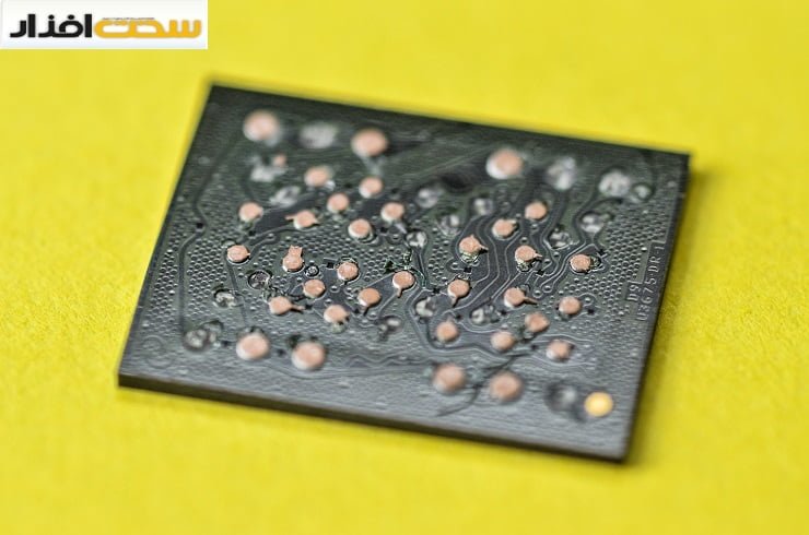 در تصویر زیر جایگاه اتصال پایه های تراشه های سیلیکونی مشخص است.تراشه ها از طریق دریافت پالس های الکترونیکی که از طریق این نقاط به آنها اعمال می گردد،فعالیت می کنند.لازم به ذکر است که بیرون آوردن این تراشه ها از برد کار آسانی نیست.