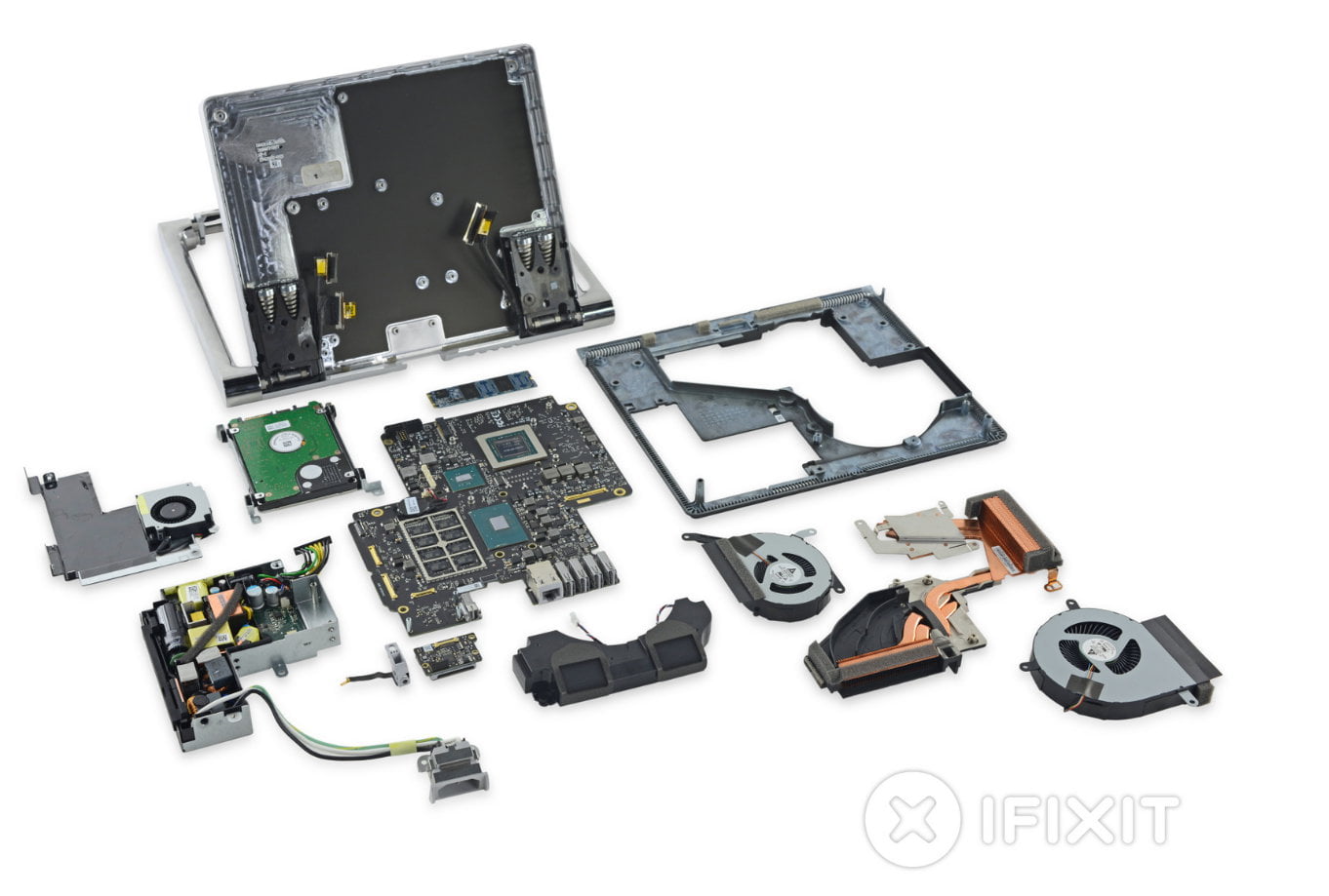 همان طور که پیش بینی میشد، برخی از بخش های سرفیس استودیو مشابه آی مک اپل طراحی شده است. مانند ضربه گیر های پلاستیکی که برای پیچ های بلندگوها به کار گرفته شده است و همچنین پنل صفحه نمایش نیز همانند صفحه نمایش آی مک در جای خود قرار گرفته است. طبق انتظار، طراحی برد اصلی سرفیس استودیو به شکلی است که امکان ارتقای حافظه ی رم و پردازنده وجود ندارد و این دو قطعه به صورت یکپارچه با برد طراحی شده اند ، بنابراین در صورتی که خواهان پردازنده ی قدرتمند تر یا رم بیشتر هستید، باید هزینه ی بیشتری را متحمل شوید. بر اساس این کالبد شکافی، تعویض صفحه نمایش سرفیس استودیو نسبت به آی مک کمی سخت تر است اما به همان اندازه نیز این کار ممکن است. علاوه بر این، از آنجا که اکثر قطعات مهم در پایه ی سرفیس استودیو جای گرفته اند، مواقع کمتری به جداسازی صفحه نمایش لازم خواهد بود.
