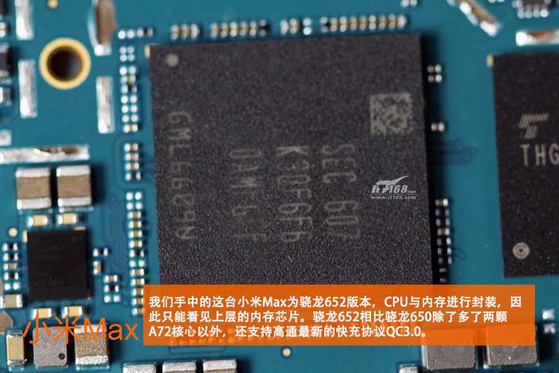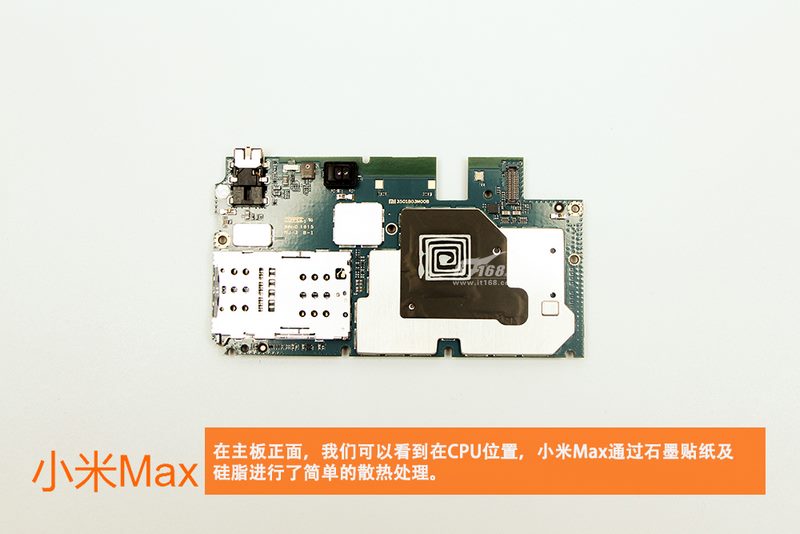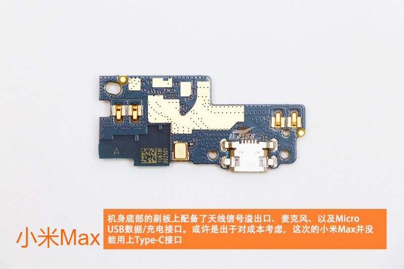 چیپ های اصلی بر روی برد اصلی متمرکز شده اند و به دلیل استفاده از چیپست اسنپدراگون 652، یکپارچگی بیشتری مشاهده میشود. برد اصلی  Mi Max بسیار مرتب به نظر میرسد. در تصویر زیر یک جای خالی جوش داده شده مشخص شده است که احتمالا جایگاه چیپ NFC است.