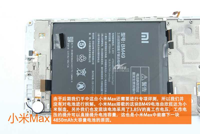 شیائومی Mi Max مجهز به یک باطری  لیتیوم پلیمر 4850 میلی آمپر ساعتی 3.85 ولت با پارت نامبر BM49 است. عمر باطری Mi Max شگفت انگیز است.