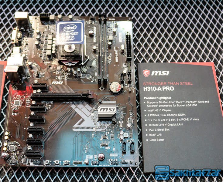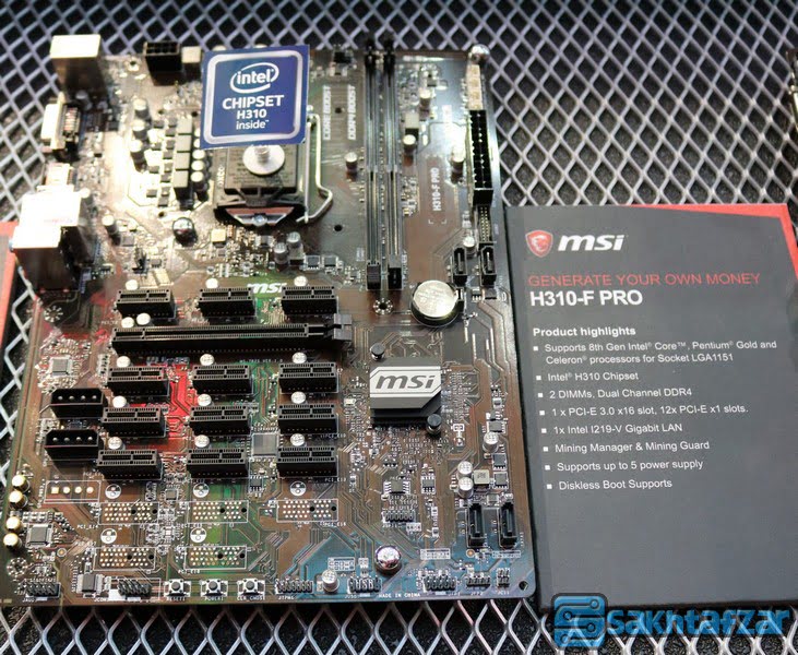 در میان مدل های گیمینگ و حرفه ای، MSI قصد جداسازی خط تولید برای ارائه مدل های مخصوص ماینینگ را دارد. این شرکت مادربرد MSI B360-F PRO را برای همین هدف معرفی کرده است. مادربرد MSI H310-F PRO می تواند 13 کارت گرافیک را مدیریت کند. این مادربرد دارای 12 اسلات PCIe x1 و یک اسلات کامل PCIe x16 است. اتصال اضافی Molex نیز برای تامین نیروی اسلات های PCI بر روی آن به چشم می خورد. دو اسلات DDR4 DIMM نیز در بالای برد وجود دارد. با کمی دقت بر روی PCB می توان جای خالی 5 اسلات PCIe x1 دیگر را مشاهده کرد که احتمالا برای تراشه های دیگر مانند B360 در نظر گرفته شده و نشان از محدودیت تراشه H310 است. 4 کانکتور فن بر روی برد موجود است و MSI H310-F PRO دارای 4 رابط SATA است. بر روی برد خبری از رابط M.2 به چشم نمی خورد و می توان مطمئن بود که MSI H310-F PRO تنها برای ماینرهای حرفه ای طراحی و تولید شده است.