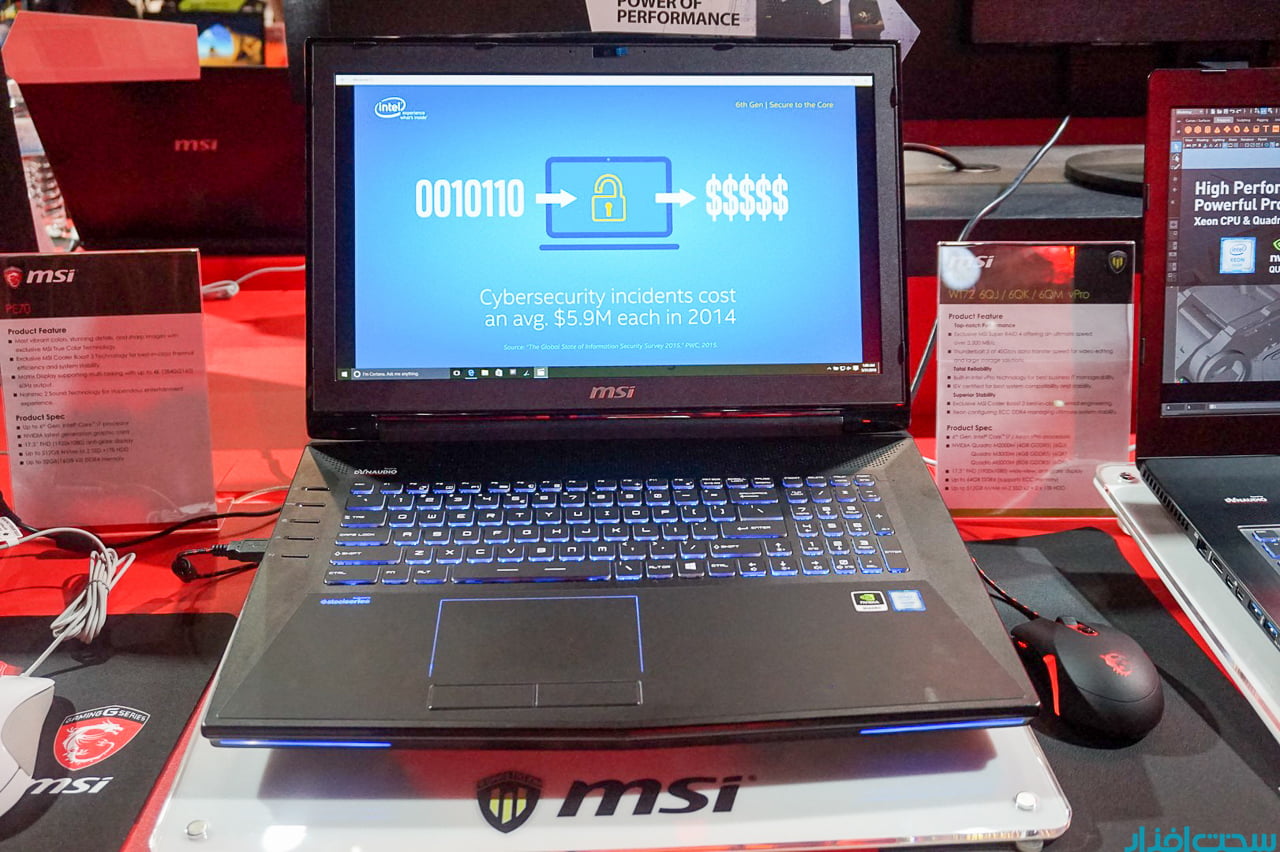 پ تاپ جدید این کمپانی تحت عنوان WT72 یک ماشین پردازشی توانمند است.این لپ تاپ همانطور که از نامش نیز پیدا است،در زمره مدل های ایستگاه کاری (WorkStation) قرار گرفته و می تواند به عنوان یک دستیار توانمند در نرم افزارهای رندرینگ،مهندسی و…نیز مورد استفاده قرار گیرد.یکی از قابلیت های سری WT استفاده از قطعات الکترونیکی با طول عمر بالا و همچنین توانایی سخت افزارها در تحمل دما و زمان بالای کاری است.این لپ تاپ در 3 کانفیگ عرضه می شود که قدرتمند ترین آن دارای پردازنده اینتل XEON E3-1505M-v5 است.این پردازنده در فرکانس موثر کاری (2.8~3.7 گیگاهرتز) فعالیت کرده و در کنار چیپست CM236 می تواند به خوبی در یک مدیریت حرفه ای قرار گیرد.MSI در زمینه I/O و تجهیزات جانبی نیز سنگ تمام گذاشته است.پورت های USB 3.1 و C از جمله آنها هستند.یک بلو-ری رایتر،ساب ووفر داخلی به همراه اسپیکرهای Dynaudio و توان 6 وات از جمله دیگر امکانات WT72 هستند.64 گیگابایت حافظه ی رم برای این محصول نصب شده است.حافظه های DDR4 با فرکانس موثر 2133 مگاهرتز.یک مانیتور 17.3 اینچی با پشتیبانی از رزولوشن UHD/4K نیز سخت افزارهای را همراهی می کند.از همین رو می توان این لپ تاپ را یک محصول نسبتا بزرگ دانست.نمایشگر از گواهینامه Adobe RGB برخوردار است.کارت گرافیک های انویدیا QUADRO نیز پردازش های گرافیکی را بر عهده دارد.این کارت گرافیک (M500M) به همراه 8 گیگابایت حافظه ی GDDR5 به نسبت مدل پیشین خود تا 35% درصد سریعتر و با بهبود هماهنگی با نرم افزارهای معماری،می تواند از پس هر پردازشی برآید.MSI اعلام کرده است که این لپ تاپ توسط نرم افزارهای Autodesk مورد آزمایش و تست های گوناگون قرار گرفته است.این کارت گرافیک را می توان توانمند ترین کارت گرافیک جهان دانست.یک باتری 9 سلولی وظیفه تامین انرژی را بر عهده دارد.