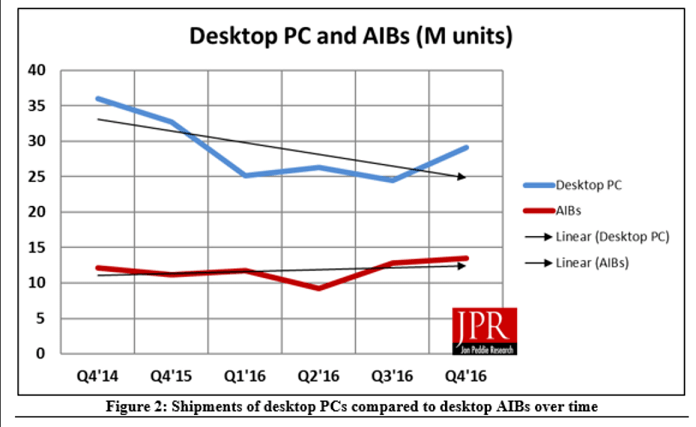 اما انویدیا دارای 3 پرچمدار GTX1080/1070 و TITAN X 2016 است که به زودی کارت گرافیک GTX1080 Ti نیز به آنها افزوده می شود. این روند چه تغییری به نسبت 3 ماهه پیشین کرده است؟ سهم انویدیا در 3 ماهه سوم سال 2016 یا Q3 2016 برابر با 70.2% بوده است که 0.3% رشد را در 3 ماهه بعدی تجربه کرده است. اما بر خلاف تیم سبزها، AMD در 3 ماهه پیشین 29.8% از بازار کارت گرافیک ها را به خود اختصاص داده است که 0.3% کاهش را در 3 ماهه بعد تجربه کرده است. اما در ادامه به شاخه های اصلی عرضه GPU می پردازیم؛ سیلیکون هایی که در کارت گرافیک های دسکتاپ عرضه شده اند، به طور ناگهانی تا 19.4% رشد را تجربه کرده اند؛ این در حالی است که در مدت زمان مشابه در سال 2015 این روند سیر نزولی به خود گرفته بود. AIB شامل فروش OEM تراشه ها است. به عنوان مثال کامپیوتر های آماده، سرور و سیستم های خاص در دسته بندی AIB قرار می گیرند. این گروه از بازار نیز رشد 5.6% خود ارتقاء یافته است.