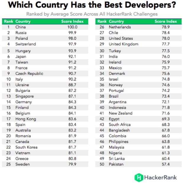 در بین صدها هزار برنامه نویس، میتوان گفت که چین و روسیه بهترین توسعه دهندگان نرم افزار را دارند. بر اساس گزارشات سایت HackerRank در کالیفرنیا مشخص شده که بهترین توسعه دهندگان نرم افزار در کشور چین هستند. کشور روسیه در این رتبه بندی، دوم شده و لهستان به عنوان سومین کشور انتخاب شده است. در این رتبه بندی دو کشور آمریکا و هند که از بهترین های سالهای گذشته بودند؛ به ترتیب رتبه ی 28 و 31 را بدست آوردند.