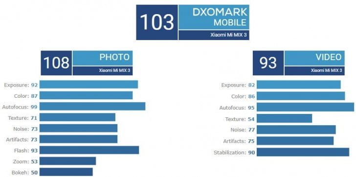 Mi Mix 3 موفق شد در این تست بهترین امتیاز را در میان تمام گوشیهای تاریخ شیائومی کسب کند. امتیاز کلی شیائومی 103 بوده است که این از ترکیب امتیاز 108 در بخش عکاسی و 93 در بخش فیلمبرداری حاصل شده است. بر مقایسه کافیست بدانید که تا امروز گوشیهای گلکسی نوت 9 سامسونگ و U12+ اچتیسی موفق به کسب امتیاز 103 شدهاند و تنها گوشیهای آیفون XS Max با امتیاز 105 و P20 Pro هواوی با امتیاز 109 بالاتر از این گوشیها قرار گرفتهاند. DxO در توصیف دوربین می میکس 3 گفته است که در فوکس خودکار سریع و دقیق است، عملکرد عالی در کار با نور فلش دارد، رنج دینامیکی آن در محیط داخل و خارج گسترده است و وایت بالانس خوبی دارد. در خصوص معایب این دوربین هم عنوان کرده بود در صحنههایی با کنتراست بالا، میزان نویز زیاد است، در فیلمبرداری در شرایط کم نور هم این مشکل وجود دارد، علاوهبراین در هنگام تغییر صحنه فوکس خودکار دچار خطا میشود. با این حال امتیاز 103 یعنی می میکس 3 یکی از بهترین دوربینهای بازار را در بین گوشیهای هوشمند در اختیار دارد و این مشکلات غیرقابل تحمل نیستند.