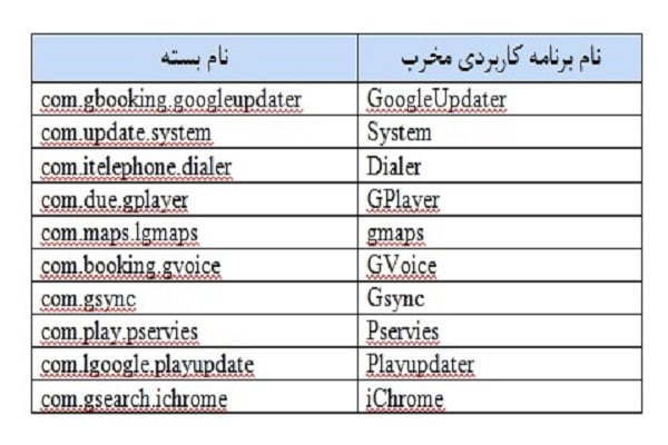 در جدول زیر می توانید فهرستی از نام برنامه های کاربردی مخرب به همراه نام بسته آنها مشاهده کنید.
