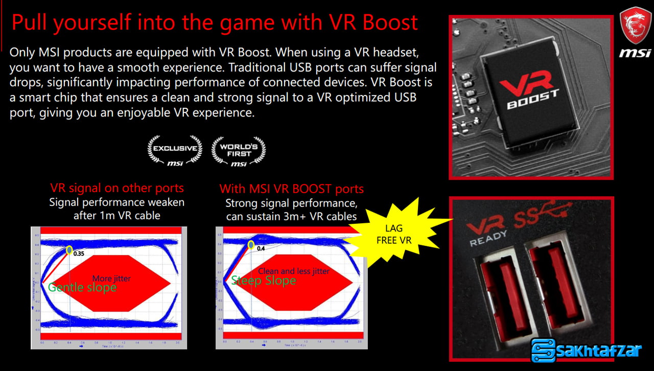 واقعیت مجازی یک فناوری رو به رشد و در حال توسعه است که MSI توجه ویژه ای به آن دارد. از این رو یک چیپ ست اختصاصی با نام VR BOOST وظیفه تامین توان دو عدد پورت USB را برای اتصال هدست واقعیت مجازی بر عهده دارد. مسیر خروجی این دو پورت به صورت مجزا تامین می شود و در نتیجه پهنای باند خالص در اختیار هدست واقعیت مجازی قرار می گیرد. این فناوری نیز به صورت انحصاری توسط MSI مورد استفاده می گیرد و اولین برند در جهان به شمار می رود که راه حلی برای هدست های واقعیت مجازی ارائه داده است.