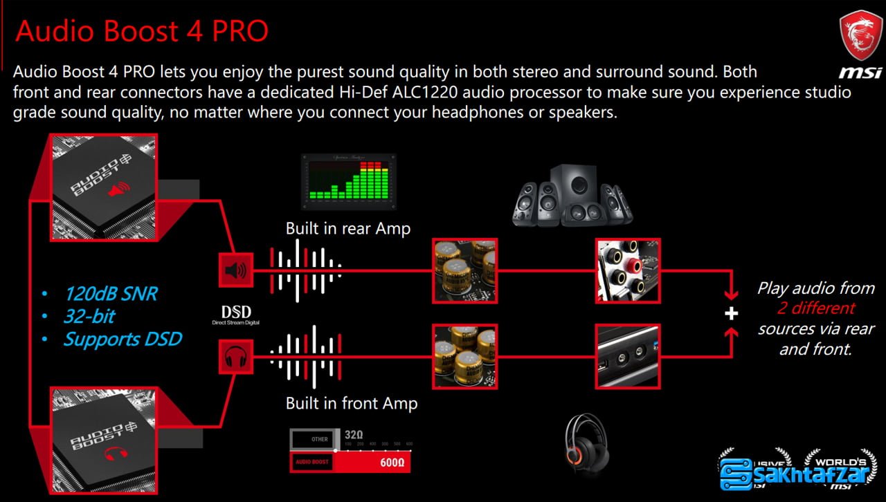 گیمرها بیش از هر کاربر دیگری به صدا اهمیت می دهند. با توجه به تمرکز MSI روی ارائه صدای با کیفیت و بدون نویز در مادربرد های گیمینگ و حرفه ای خود و سابقه طولانی این برند، هم اکنون فناوری Audio Boost 4 به ارائه نسبت سیگنال به نویز 120 دسی بل، کیفیت صدای 32 بیتی و پشتیبانی از Dolby Sound Digital می پردازد. MSI برای افزایش کیفیت صدا در کانکتور های جلو و پشت کیس، از آمپلی فایر های مجزا استفاده می کند تا تداخلی میان این دو بخش رخ ندهد. کانال های اختصاصی برای مدار صوتی روی مادربرد، مدار ایزوله، دیود های نوری RGB با افکت های متنوع، خازن های اختصاصی برای ارائه صدای گرم و جذاب و مدار محافظ De-POP از سایر امکانات مادربرد های جدید MSI هستند.