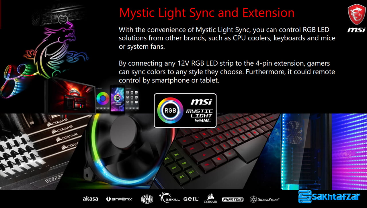 جذاب ترین بخش مراسم رونمایی از مادربرد های جدید MSI به بیان ویژگی های متمایز و منحصر به فرد آنها اختصاص داده شد که اولین ویژگی معرفی شده، نورپردازی RGB LED با نام Mystic Light بود. این ویژگی به شخصی سازی نورپردازی روی مادربرد و کارت های گرافیک MSI اختصاص دارد و توسط نرم افزار MSI Gaming App در سیستم های عامل اندروید و iOS نیز قابل دسترسی است. تنظیم رنگ و افکت های نورپردازی سبب ارائه جلوه های زیبایی به سیستم گیمینگ شما می شود. قابلیت یکپارچه سازی با تولیدات سایر برند ها که از ویژگی RGB LED بهره می برند، در مادربرد های جدید MSI وجود دارد که به یکپارچه سازی سیستم نورپردازی منجر می شود.