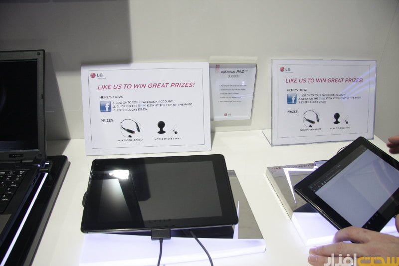 امسال نمايشگاه MWC براي شرکت الجي بيش از سالهاي ديگر جنبه قدرتنمايي داشت و اگر اغراق نباشد اين شرکت يکي از معدود شرکتهايي بود که اين تعداد محصول جديد را در نمايشگاه به نمايش گذاشته بود. در ابتداي ورود به غرفه ال جي با يک بنر جالب رو به رو ميشديد که روي ان نوشته بود وارد فيس بوک شويد ما را لايک کنيد و بعد شانس خود را امتحان کنيد تا شايد يکي از برندگان جايزههاي بزرگ ما باشيد.