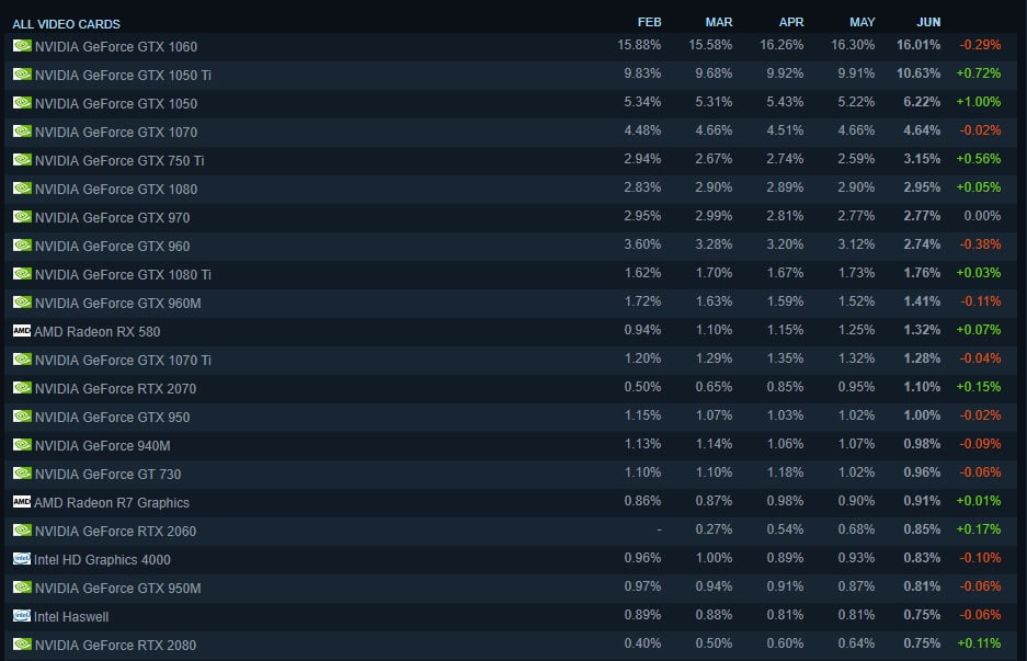در حال حاضر کارت های گرافیک GTX 1060، GTX 1050 Ti و مدل های پاسکال، برتری کامل را در این جدول داشته و مدل های NVIDIA Turing نیز در حال توسعه هستند. از خانواده جدید انویدیا، کارت گرافیک RTX 2070 با رشد جدید خود به 1.10 درصد رسیده است. به واقع تمامی مدل های RTX 20 در ماه گذشته با روند رو به رشد، هرچند کم، روبرو بوده اند.
