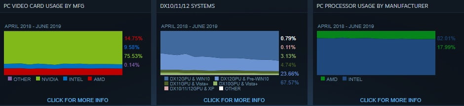 در زمینه سهم کارت های گرافیک در این بازار، همچنان فاصله NVIDIA با رقیب قرمز رنگ خود، AMD، بسیار زیاد است. 75.53 درصد از تمامی کارت های گرافیک مورد استفاده، مربوط به برند NVIDIA است. سهم AMD از این مقدار 14.57 درصد است. سهم اینتل که به گرافیک مجتمع وابسته است نیز حتی زیر 1 درصد است. این نشان می دهد که بازی های جدید به هیچ وجه نمی توانند در این تراشه ها اجرا شوند.