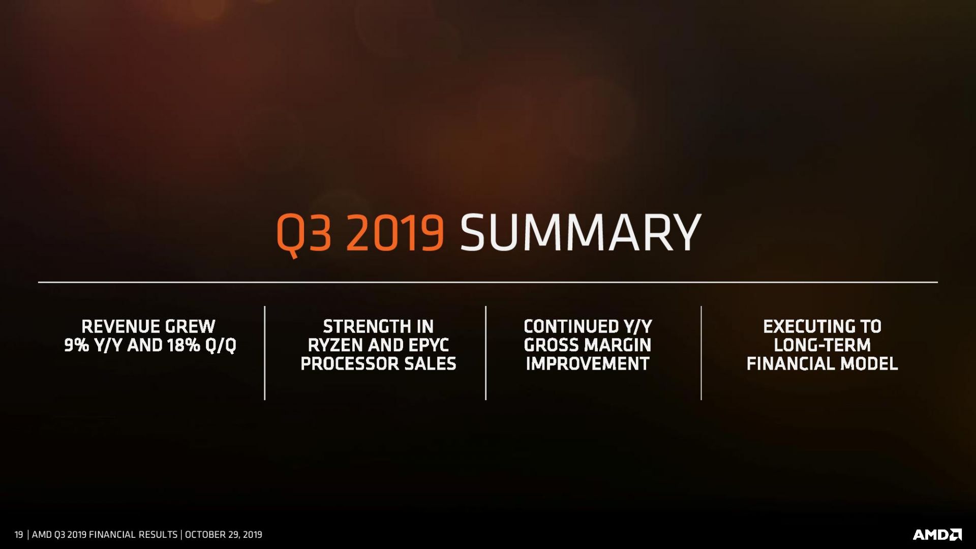 موفقیت AMD به واسطه عملکرد فوق العاده بخش پردازندههای دسکتاپ این کمپانی و فروش بسیار خوب پردازندههای 7 نانومتری رایزن 3000 که استقبال از آنها همچنان ادامه دارد و حتی AMD را در تامین برخی از مدلها دچار مشکل کرده به دست آمده است. درآمد این کمپانی از فروش پردازندهها نسبت به سال قبل 36 درصد افزایش یافته اما مسئله کمبود موجودی ممکن است جلوی رشد فروش کمپانی را بگیرد. در حال حاضر قیمت پردازندههای رده بالای رایزن در حال افزایش است و میانگین قیمت فروش پردازندههای این شرکت رو به رشد است. همچنین AMD اعلام کرده است که سهم کمپانی از بازار پردازندهها در سه ماهه سوم سال بیشتر شده تا برای هشتمین سه ماهه متوالی این اتفاق صورت گرفته باشد.