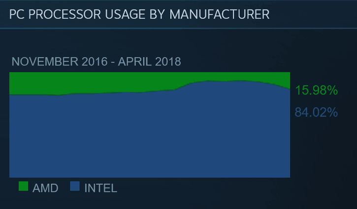 سهم AMD از CPU هایی که برای سیستم های بازی توسط کاربران استیم مورد استفاده قرار گرفته است، در ماه آوریل تقریبا به 16 درصد رسیده است. هر چند که این سهم همچنان در برابر اینتل ناچیز به نظر می رسد، اما در نهایت رقم مناسب و یک پیشرفت چشمگیر به حساب می آید.