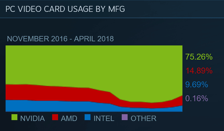 از سوی دیگر، افزایش سهم این شرکت از بازار سخت افزارهای اصلی، به CPU ختم نشده و شاهد پیشرفت آن در بخش GPU نیز هستیم. کارت گرافیک های این شرکت از 11 درصد به 15 درصد افزایش یافته است. 53% از کاربران استیم از سیستم عامل ویندوز 10 نسخه 64 بیتی بهره می برند. کارت گرافیک GeForce GTX 1060 محبوب ترین GPU توسط گیمرهای این شبکه است و 61% از گیمرها، در دقت FHD به انجام بازی می پردازند. شایان ذکر است که گزارش های Steam نمی تواند به عنوان برترین مرجع از وضعیت های جهانی خبر داده اما با این وجود تا حدودی به جمع بندی نسبی می پردازد که جالب توجه است.