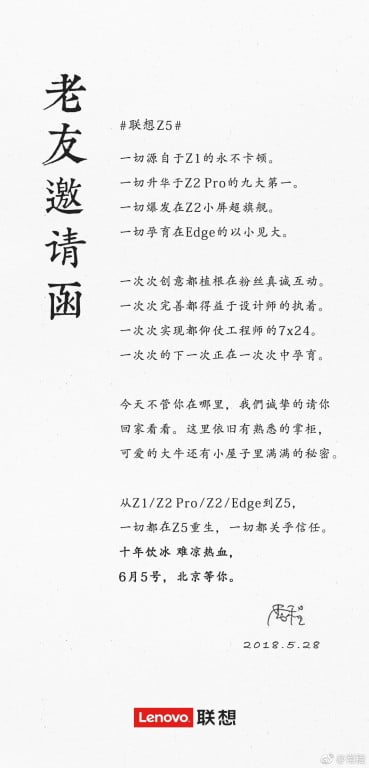 این گوشی در تاریخ 5 ژوئن (15خرداد) به طور رسمی معرفی خواهد شد، این خبر توسط چانگ چنگ معاون ارشد لنوو و مدیرعامل سابق ZUK تأیید شده است. رویداد معرفی گوشی Lenovo Z5 در ساعت 2 بعد از ظهر در پکن چین برگزار خواهد شد. امروز چنگ در پستی جداگانه اعلام کرده است که که گوشی Z5 دنباله روی گوشی های Z1، Z2 Pro و Z2 برند ZUK خواهد شد. او همچنین در کنار پوستر معرفی این گوشی متنی متعهدانه منتشر کرد که حاکی از آنست که انجام فداکاری و تعهد 24/7 و پشتیبانی هوادارن دلیل اصلی اینست که Z5 در این تاریخ رونمایی می شود.