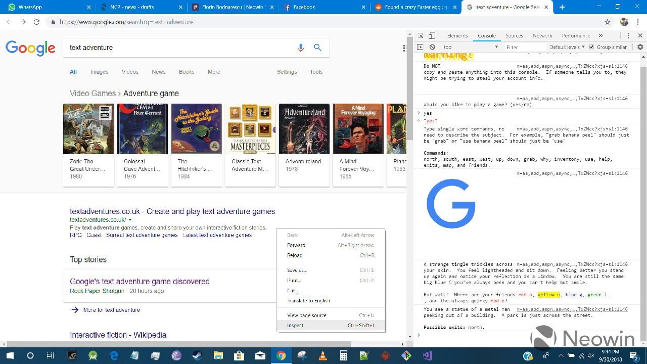این بازی میتواند با جستجو اصطلاح “text adventure” با استفاده از موتور جستجو گوگل پیدا شود، سپس اگر از ویندوز استفاده میکنید، کلیدهای ترکیبی “Ctrl + Shift + I” و اگر از مک استفاده میکنید، کلیدهای ترکیبی “Cmd + Shift + I” را فشار دهید. همچنین اگر علاقهای به استفاده از میانبرها ندارید، هرجایی از صفحه کلیک راست کنید و گزینه “Inspect” را انتخاب کنید. سپس بعد از انجام این مراحل، به جایی که میتوانید بازی را ببینید؛ یعنی به صفحه “Console” که در پنل سمت راست ظاهر میشود، بروید.