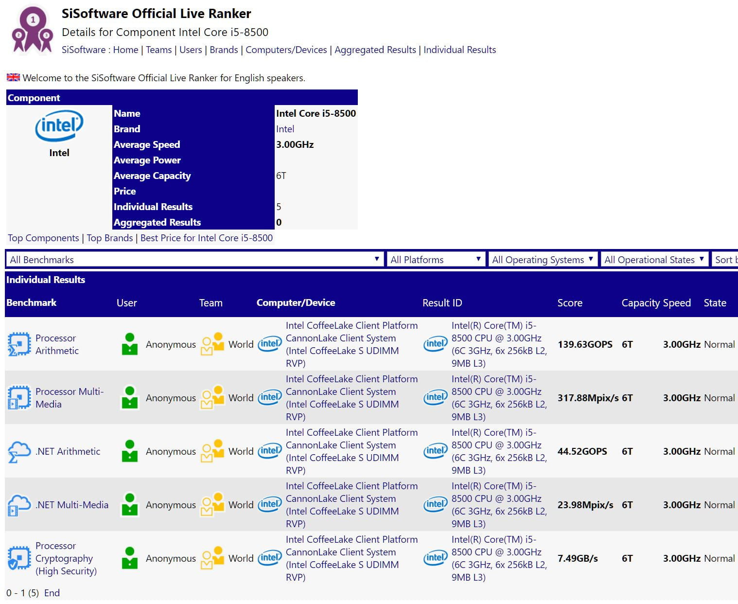 پس از ورود به سال 2018، باید در انتظار عرضه باقی مدل های CPU های Intel CofeeLake باشیم. نسل هشتم پردازنده های اینتل در برخی مدل های پرچمدار، در اواخر سال 2017 راهی بازار شد و اینک اینتل با وجود حواشی امنیتی، این شرکت همکاری خود با پایگاه داده SiSoft SANDRA را از سر گرفته است. این پایگاه داده به تازگی اطلاعات رسمی از یک CPU با نام Intel Core i5-8500 را منتشر کرده است.