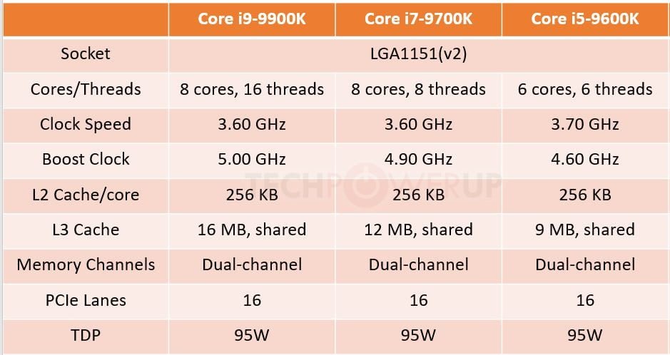 این محصول دارای 8 هسته و 16 رشته پردازشی است. Core i9-9900K دارای 16 مگابایت کش L3 بوده و فرکانس های 3.6~5.0 گیگاهرتز را به همراه دارد. خوشبختانه توان حرارتی یک MSDT جدید اینتل همچنان بر روی حداکثر 95 وات باقی مانده است. اینطور که پیداست، فرکانس 5.0 گیگاهرتز در این مدل برای حداکثر 2 هسته فراهم می گردد. 4.8 گیگاهرتز برای 4 هسته و 4.7 گیگاهرتز نیز برای 6 تا 8 هسته. دومین مدل با نام Intel Core i7 9700K نیز با دارای بودن قابلیت اورکلاک 8 هسته و 8 رشته پردازشی، دارای 12 مگابایت کش L3 بوده و فرکانس های آن 3.6~4.9 گیگاهرتز هستند.