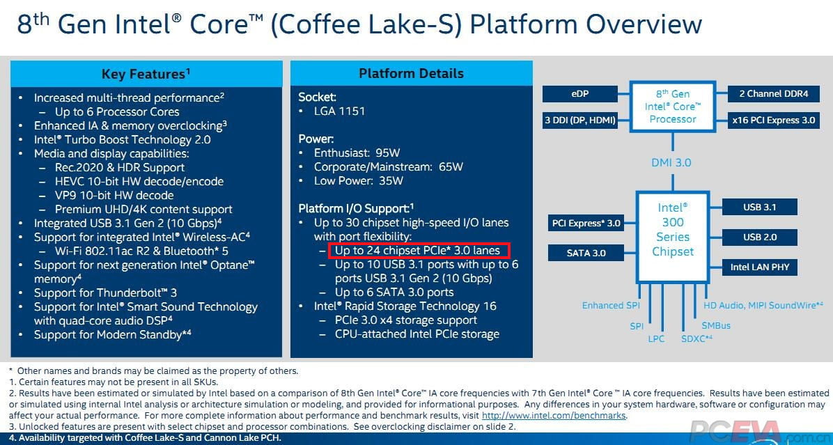 نسل هشتم از پردازنده های اینتل موسوم به Coffee Lake در اوایل سال 2018 وارد بازار خواهند شد؛ این پردازنده ها سنت شکنی کرده و تعداد هسته، رشته و مقدار کش در آنها افزایش یافته است. و اما طی آخرین اخبار، اسلاید هایی از این محصولات منتشر شده است که نشان دهنده امکانات نهفته در چیپست (PCH) و کنترلرهای موجود در پردازشگرهای کافی لیک است. تراشه Intel Z370 Express در مادربردهای پرچمدار این گروه به خدمت گرفته خواهد شد و برای اولین در پلتفرم های Mainstream شاهد پشتیبانی از 24 خط PCI-Express gen 3.0 خواهیم بود. مسیرهای PCI-Express gen 3.0 این روزها بیش از پیش مورد استفاده قرار خواهند گرفت؛ چرا که حافظه های M.2، SSD های NVME، کارت گرافیک ها و رابط هایی همچون U.2، به این مسیر متصل می گردند.