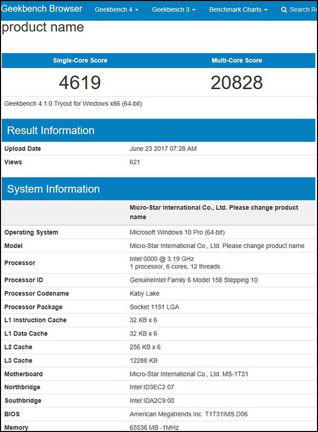 و اما پایگاه داده Geekbench نیز اطلاعات یک CPU از این سری را منتشر کرده است که دارای 6 هسته و 12 رشته پردازشی است. این محصول امتیاز 4619 را در وضعیت تک هسته و 20828 را در تمام هسته بدست آورده است. فرکانس کاری این محصول 3.2 گیگاهرتز بوده و دیگر اطلاعات آن هنوز نامشخص است. این محصول با پردازنده AMD Ryzen 5 1600X از تیم رقیب مقایسه می شود که دارای 6 هسته و 12 رشته است.