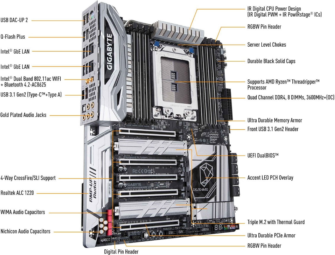 GIGABYTE X399 Designare EX بدون زرق و برق گیمینگ، مادربردی است که از امکانات آن می توان به مدرن بودن آن پی برد. اسلات های توسعه تقویت شده با فلز، رابط های SSD M2 با هیت سینک حرارتی، مدار صوتی AMP-UP با جدا سازی از مدار چاپی و قابلیت اورکلاک با میکروسوئیچ های فیزیکی و نمایشگر دیجیتالی دو خطی از جمله دیگر موارد قابل اشاره در این مدل است.