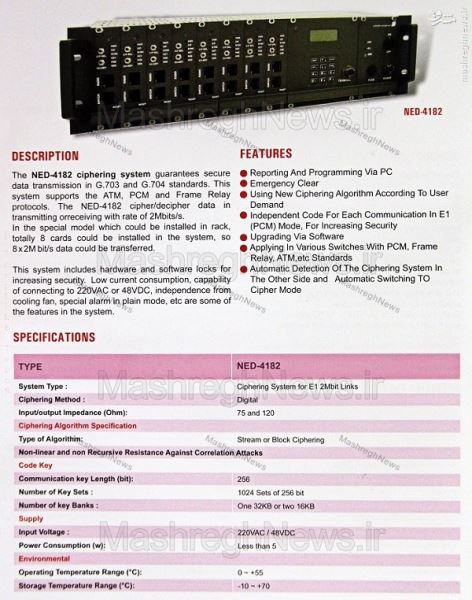 این سامانه قابلیت رمز کنندگی دیجیتال اطلاعات را داشته و می تواند انواع داده ها مثل اعداد و حروف، صدا و تصاویر را رمز کرده و ارسال کند. “NED-4182” دارای قفل های سخت افزاری و نرم افزاری در هر بخش خود، برای افزایش امنیت است و قابلیت برنامه ریزی مجدد با استفاده از وصل شدن به کامپیوتر را دارد. در انتخاب این محصولات جهت معرفی نیز تلاش شده عمدتا تجهیزاتی انتخاب شوند که تاکنون کمتر از آنها تصاویر و اطلاعات رسمی در اختیار کاربران قرار گرفته باشد که بر این اساس، در اولین گزارش، به معرفی یک سامانه مدرن رمزکننده خواهیم پرداخت.