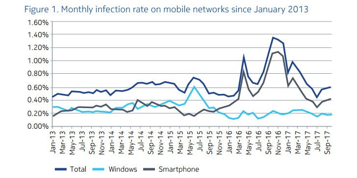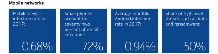 همانطور که در کامیپوترها، نرم افزارهای مخربی مانند WannaCry سیستم کاربران و سازمان های دولتی را مورد حمله قرار میدهد، گوشی های هوشمند نیز از دست ویروس ها در امان نیستند. گزارشی که نوکیا به تازگی منتشر کرده است، نشان میدهد که اکثر دستگاه های آلوده در شبکه های موبایلی، گوشی های اندرویدی بودند. با این وجود نوکیا تلاش های گوگل برای محافظت از فروشگاه Google Play مورد تقدیر قرار داده است و گفته است که این سیستم دفاعی این فروشگاه در مقایسه با دو سال پیش بسیار پیشرفت کرده است. اما از طرف دیگر فروشگاه های شخص ثالث که سطح امنیت آنها پایین تر است و کمتر محافظت شده اند، یک منبع قابل پیش بینی برای آلوده کردن گوشی های اندرویدی هستند.