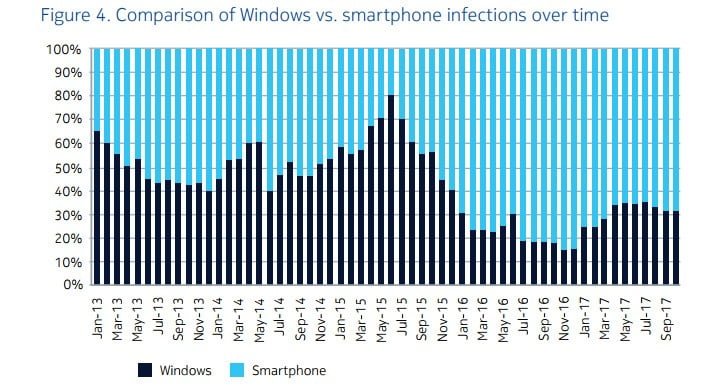 نوکیا برای جمع آوری این اطلاعات از NetGuard استفاده کرده است که یک نرم افزار امنیتی مورد استفاده در اپراتورهای شبکه موبایل است. به این ترتیب نوکیا توانسته است دستگاه های آلوده را بدون نرم افزاری خاص در شخص سرویس گیرنده تشخیص دهد. تصویر پایین میزان آلودگی گوشی های هوشمند و سیستم های ویندوزی را نشان میدهد.