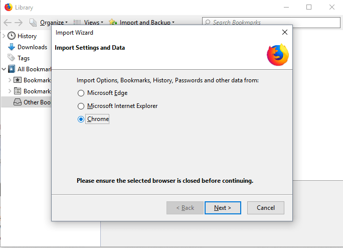 در این کادر باز شده میتوانید مرورگری را که از آن استفاده میکنید را انتخاب کنید تا تمامی اطلاعاتتان، از آن مرورگر به فایرفاکس منتقل شود. سپس بر روی Next کلیک نمایید.