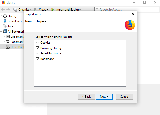 سپس باید مواردی را که میخواهید از مرورگر قبلی خود بازیابی کنید را انتخاب کنید، که این موارد شامل Bookmarkها، گذرواژه های ذخیره شده، تاریخچه ی مرورگر و کوکی ها خواهد بود. در نهایت بر روی Next کلیک کنید.