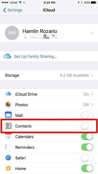ابتدا وارد تنظیمات گوشی آیفون شوید و در قسمت iCloud گزینه ی Contacts را غیر فعال یا Disable کنید.