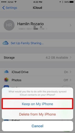 پس از غیر فعال کردن Contacts، پیغام زیر نمایش داده خواهد شد که در این پیغام اجازه ی حذف یا نگهداری Backup های قبلی را از شما میخواهد. پس بر روی گزینه ی Keep on My iPhone کلیک کنید اطلاعات را در گوشیتان داشته باشید.