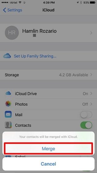 پس از انجام این مراحل، دوباره بهSetting بروید و در بخش iCloud، گزینه ی Contact را فعال یا Enable نمایید و در پیغام نمایش داده شده گزینه ی Merge را انتخاب کنید.