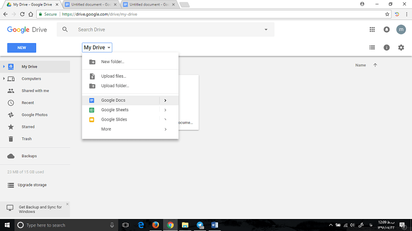 در سرویس Google Drive بر روی My Drive کلیک کرده و در منوی باز شده، Google Docs را انتخاب کنید.