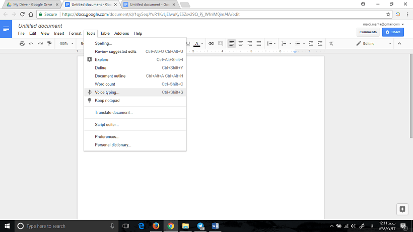 تب جدیدی برایتان در کروم باز خواهد شد که مشابه یک صفحه ی Word است. در این قسمت وارد منوی Tools شوید و بر روی Voice typing… کلیک نمایید.