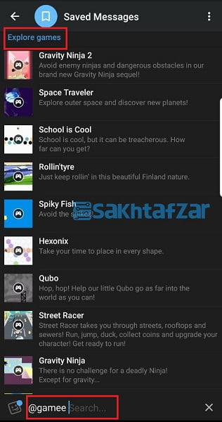 ابتدا در یکی از صفحات چت خود با دوستان، گروه و یا همان صفحه شخصی خودتان (Saved Messages) نام ربات @gamee را تایپ کنید. با تایپ این کلمه زبانه ای باز خواهد شد که تعدادی از بازی ها را به انتخاب خود ربات به شما پیشنهاد خواهد داد.