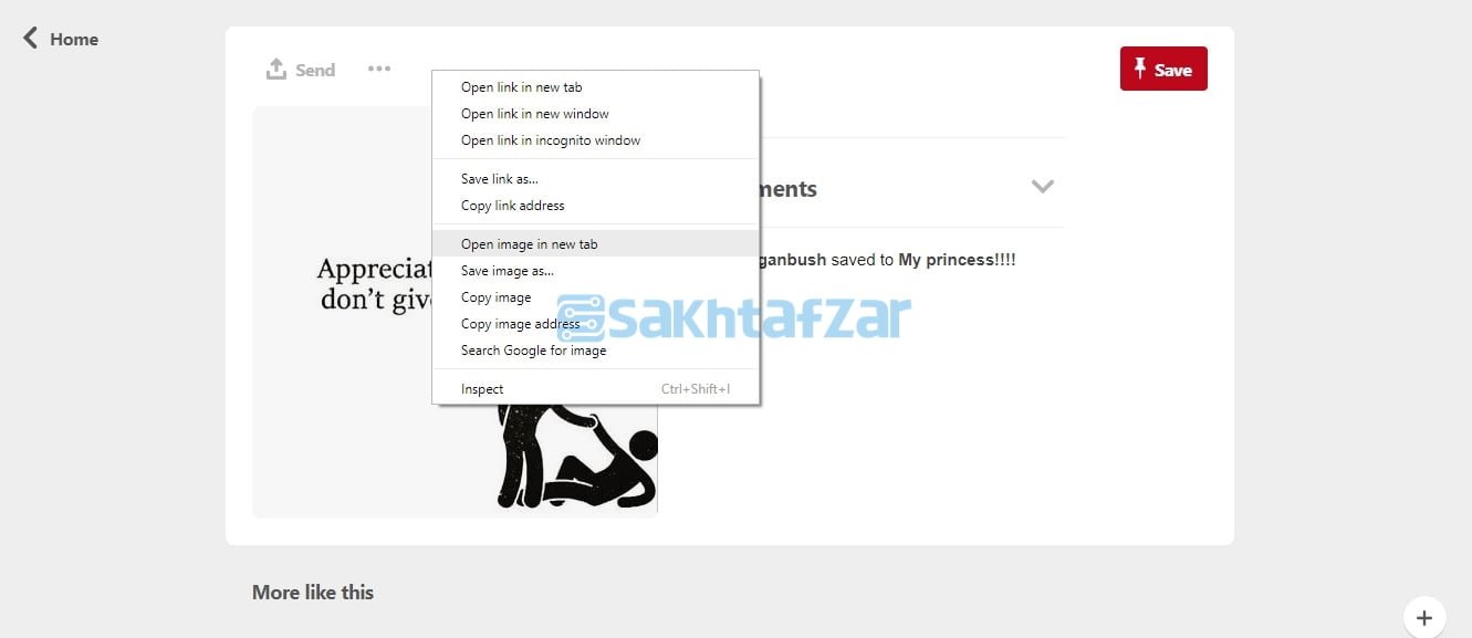 اگر شما از آن دسته از افرادی هستید که از این شبکه اجتماعی در سیستم خود بیشتر استفاده می کنید، خوب است بدانید با وجود اینکه خود پینترست تمهیداتی برای ذخیره عکس در کامپیوتر نیندیشیده است، اما امکان دانلود عکس در سیستم وجود دارد. تنها کافیست که عکس مورد نظر خودتان را انتخاب کنید و با کلیک راست بر روی آن گزینه Open Link in New Tab، آن را در یک صفحه وب جدید باز کنید.