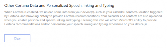 در مرحله ی بعد در بخش Other Cortana Button بر روی Clear کلیک نمایید و اطاعات ذخیره شده در تقویم، مخاطبین، موقعیت مکانی و سابقه ی مرورگر را پاک کنید. برای نهایی کردن درخواستتان مجددا در کادر باز شده بر روی Clear کلیک نمایید.