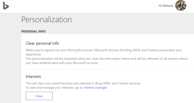 در ابتدا باید وارد صفحه ی شخصی سازی از سایت بینگ شوید. سپس در این صفحه حساب کاربری مایکروسافت خود را وارد نمایید. در این صفحه می توانید برای پاک کردن تمامی اطلاعات ذخیره شده در سایت های MSN، Bing و کورتانا اعم از اطلاعات لوکیشن، اطلاعات موجود در بخش آب و هوا، اطلاعات بخش خبری و مالی اقدام کنید.