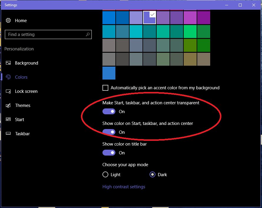 برای تغییر رنگ و شفافیت نوار وظیفه به منوی Settings > Personalization > Colors رفته و مطمئن شوید Show color on Start, taskbar, action center, and title bar روشن است ، سپس رنگ مورد علاقه خود را برای نوار وظیفه انتخاب کنید.