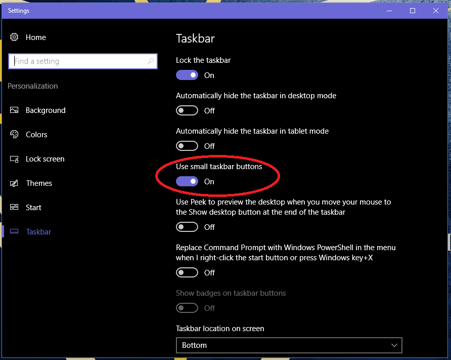 اگر احساس میکنید ایکن نرم افزار ها در نواز وظیفه اندکی بزرگ هستند با کلیک راست بر روی taskbar و کلیک بر روی setting  و روشن کردن دکمه ی Use small taskbar buttons میتوان اندازه ان ها را کوچک تر کرد. همچنین فعال کردن این گذینه موجب پاک شدن تاریخ در زیر ساعت در نوار وظیفه میشود.