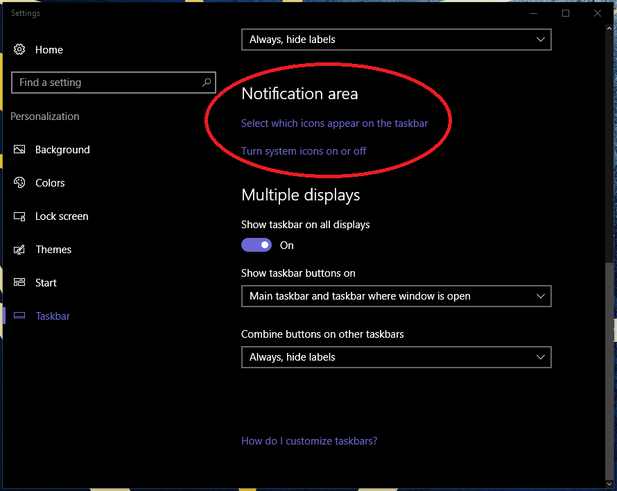بعضی اوقات ایکن های زیاد سیستم و نرم افزار ها بر روی نوار وظیفه وجو دارد و موجب سر در کمی و شلوغی این نوار می شود. در نسخه جدید ویندوز حتی آیکون هایی مانند ساعت ، صدا و شبکه را نیز میتوان حذف کرد.برای این کار با کلیک راست بر روی taskbar و کلیک بر روی setting در قسمت notification area   با کلیک بر روی Select which icons appear in the taskbar میتوان تنظیمات شخصی سازی را انجام داد.