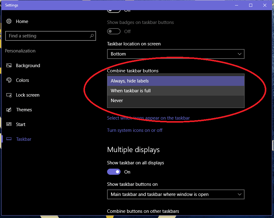 اگر ایکن های نوار وظیفه بهم ریخته و شلوغ است میتوانید آن ها را به راحتی شخصی سازی کنید.با کلیک راست بر روی نوار وظیفه و انتخاب setting  در لیست کشویی Combine taskbar buttons میتوانید گزینه مورد نظر خود برای شخصی سازی را انتخاب کنید.